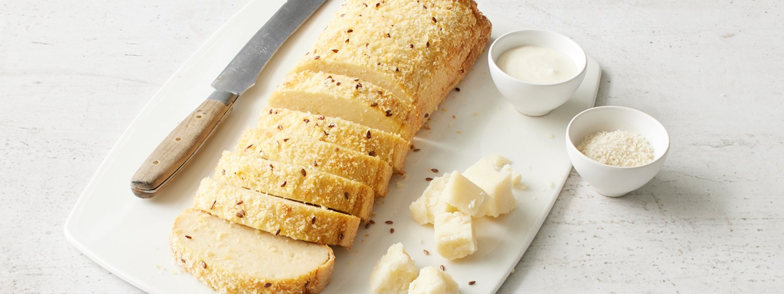 Sekoita korppujauhot, parmesanraaste ja pellavansiemenet keskenään. Ripottele päälle ja reunoille reilusti korppujauhoseosta.
