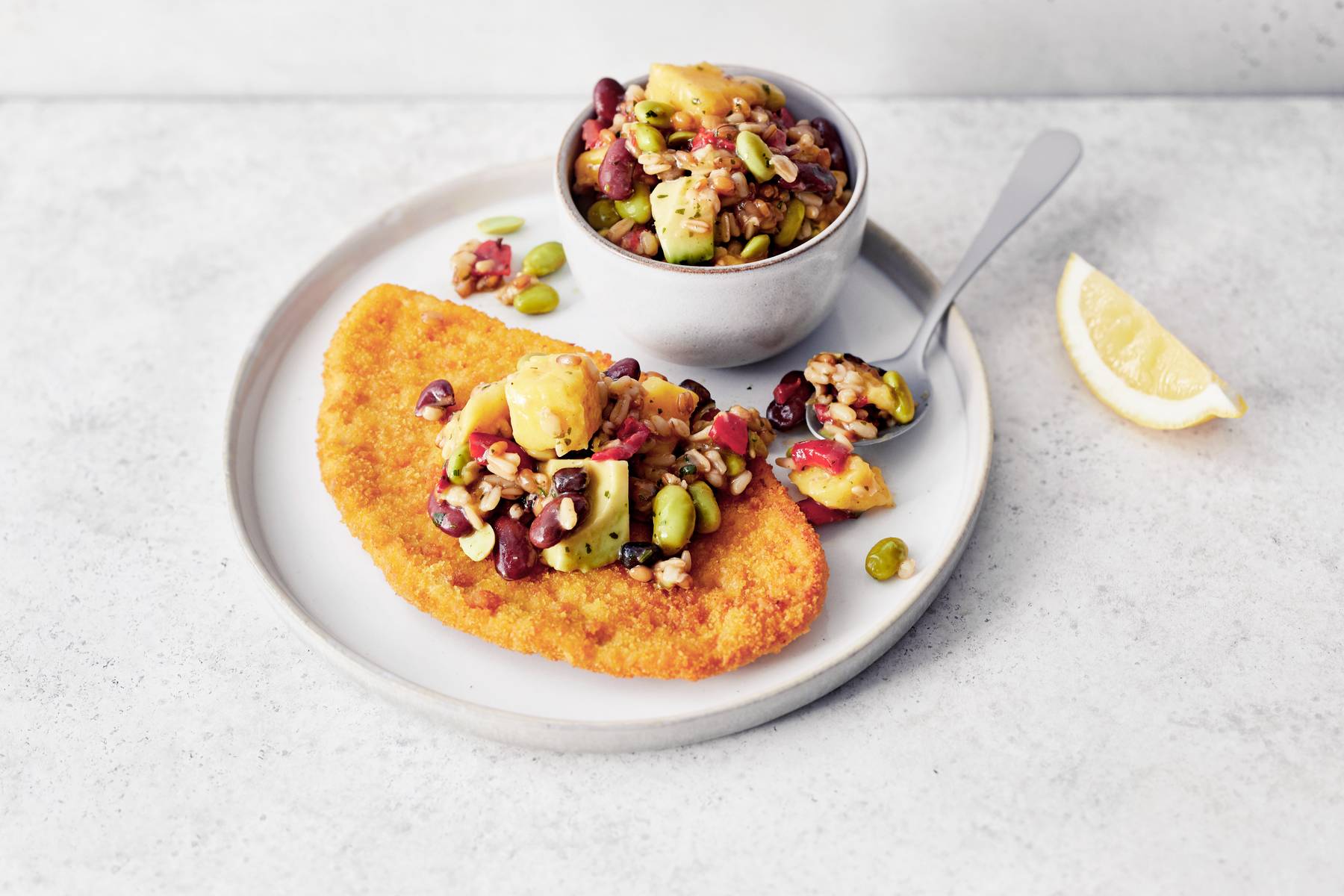 Juustokuminalla maustettu Täysjyvä-papusalaatti taipuu raikkaaksi salsaksi lisäämällä joukkoon mangoa ja avokadoa kuutioina.