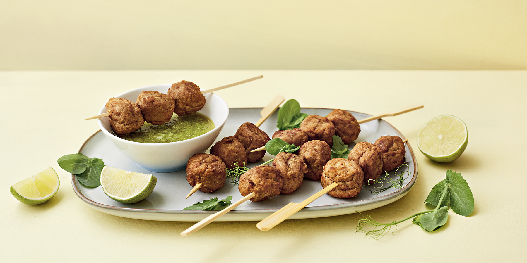 Tarjoa pyörykät peston kanssa ja viimeistele herneenversoilla.