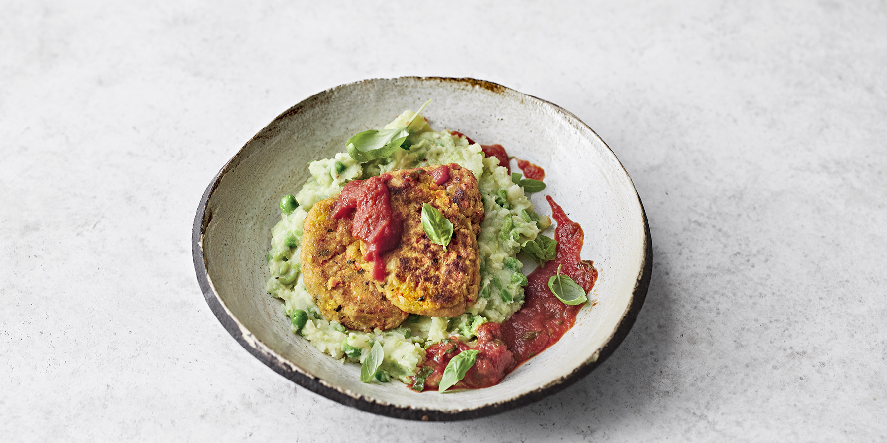 Tarjoile kasvis-papupihvit ja herne-perunasose basilikalla maustetun tomaattikastikkeen kera.
