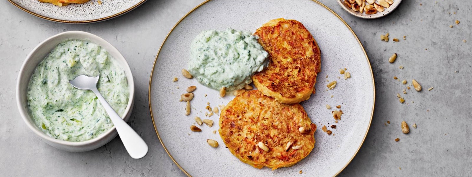 Tarjoa kasvispihvit pinaatti-rahkatsatsikin kera. Viimeistele halutessasi pinjansiemenillä.