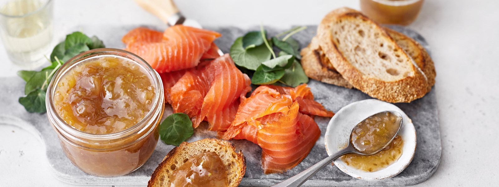Kylmäsavustettua lohta ja karviaismarjahilloa