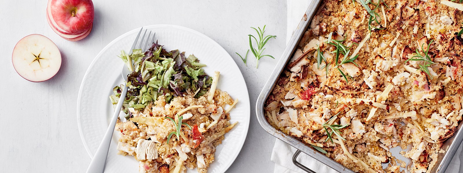 Ota vuoka uunista ja sekoita joukkoon omenakuutiot, palsternakkasuikaleet ja tomaattikuutiot. Lisää myös broilerkuutiot ja sekoita kevyesti joukkoon. Jatka paistamista vielä noin 20 minuuttia.