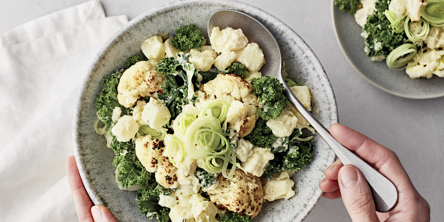 Hiero kukkakaalin pintaan rypsiöljyä ja suolaa. Paahda 230 asteisessa uunissa, kunnes on hyvä väri. Jäähdytä, leikkaa kannat pois ja pilko tarvittaessa pienemmiksi paloiksi.