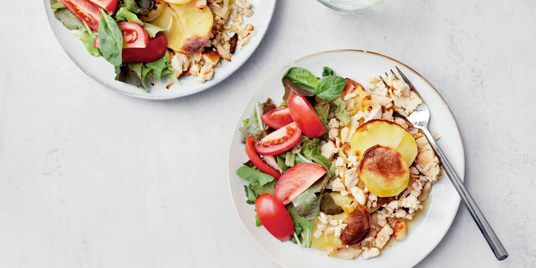 Ota vuoka uunista ja lisää perunaviipaleet, broilerviipaleet, omenakuutiot sekä liemi. Sekoita ja laita vuoka takaisin uuniin. Kuumenna 170°C yhdistelmäpaistolla noin 45 minuuttia.
