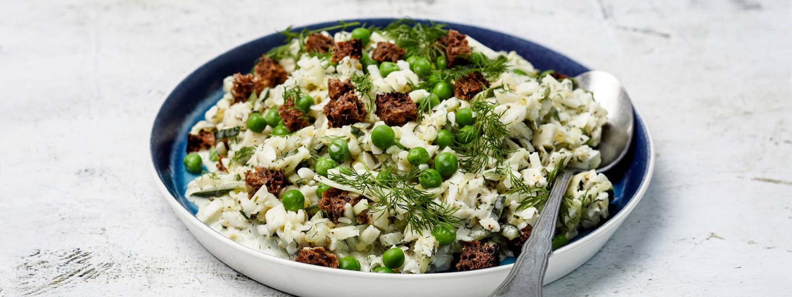 Sekoita herneet ja hienonnettu tilli Kurkkuisen salaatin joukkoon.