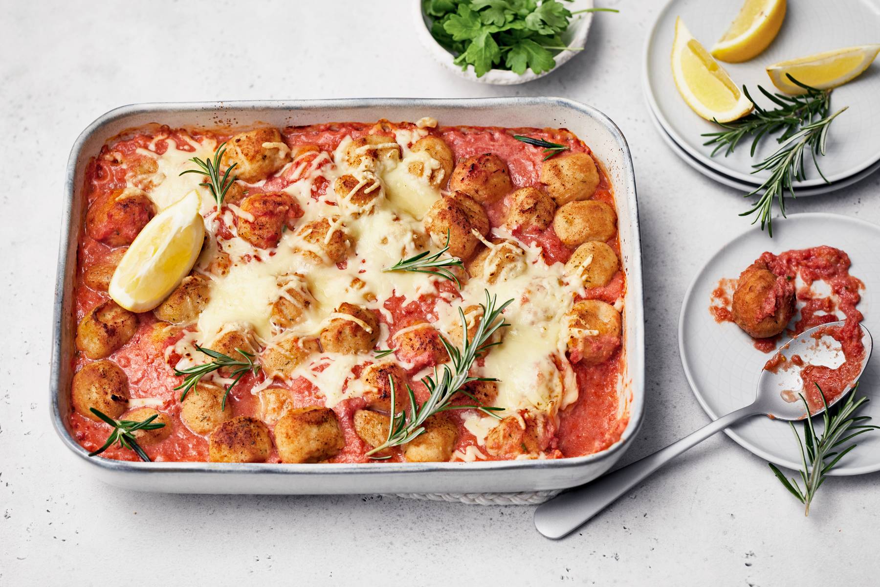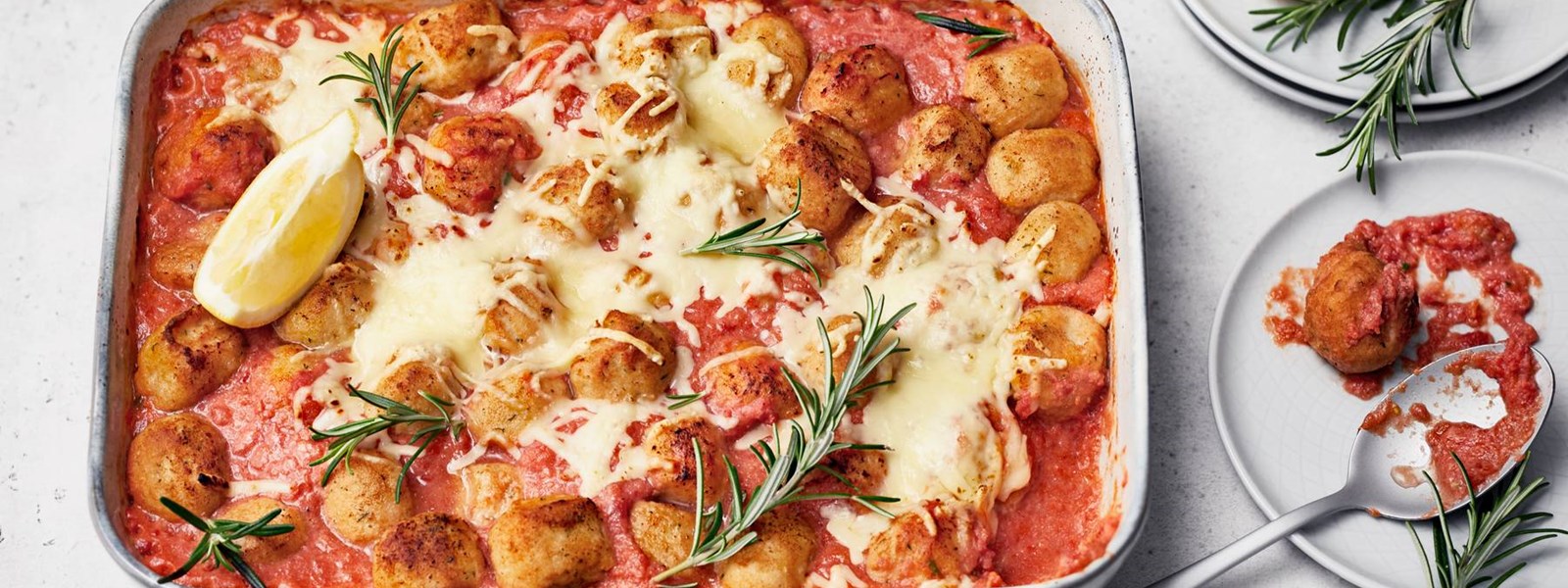 Levitä kohmeiset kalapyörykät 1/1-65 gn-vuokaan yhteen kerrokseen. Kuumenna 180 °C kiertoilmauunissa noin 15 minuuttia. Lisää kastike vuokaan tasaisesti pyöryköiden päälle. Ripottele juustoraaste pinnalle ja jatka kuumennusta vielä 15 minuuttia. Viimeistele tuoreella rosmariinilla ja sitruunalohkoilla.
