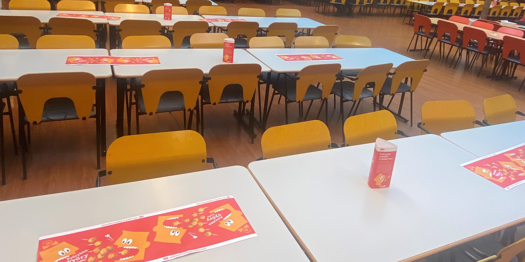 Ronko kertoo, että ruokalan pöydät oli somistettu kampanjamateriaaleilla. Lisäksi linjaston päällä ja ruokalan ovissa oli Pyörykkäpäivästä viestivää materiaalia.