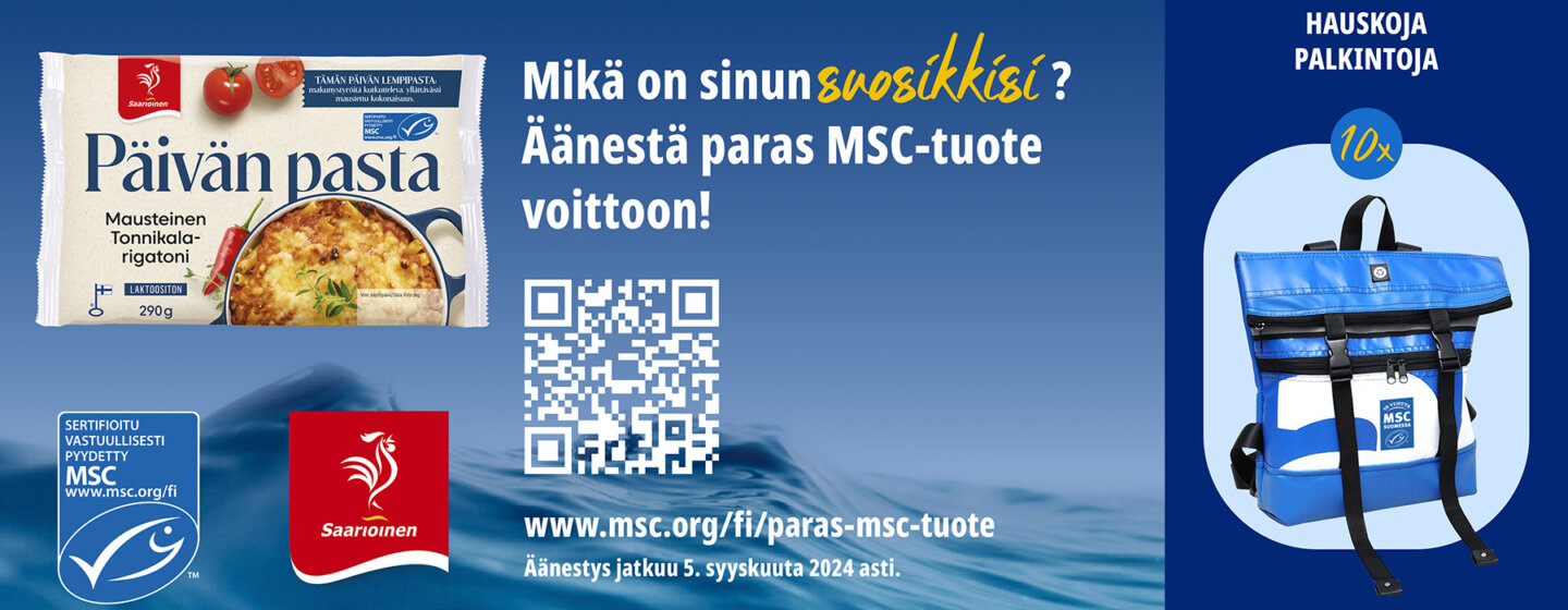 Käy äänestämässä Mausteinen Tonnikala-rigatonipastamme Parhaaksi MSC-tuotteeksi vaikka heti – voit myös voittaa hauskoja palkintoja.https://www.msc.org/fi/paras-msc-tuote