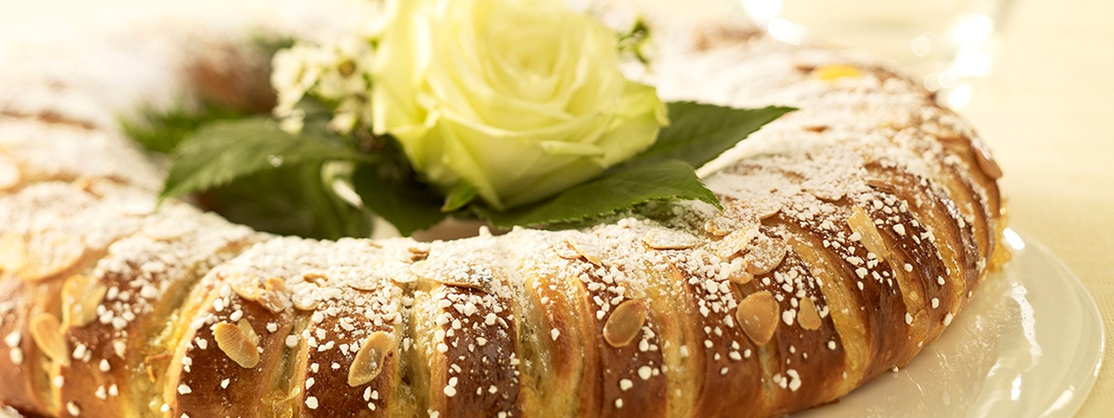 Kohota taikina pakkauksen ohjeen mukaan. Kauli taikina suorakaiteen muotoiseksi levyksi ja täytä appelsiinimarmeladilla ja raastetulla mantelimassalla. Kääri levy rullalle ja nipistä taikinan liitoskohta kiinni. Nosta rulla leivinpaperipäällysteiselle pellille kranssin muotoon ja nipistä liitoskohdat vastakkain. Leikkaa kranssin päälle veitsellä tai saksilla vinottaisia viiltoja. Anna kranssin kohota peitettynä n. ½ tuntia.