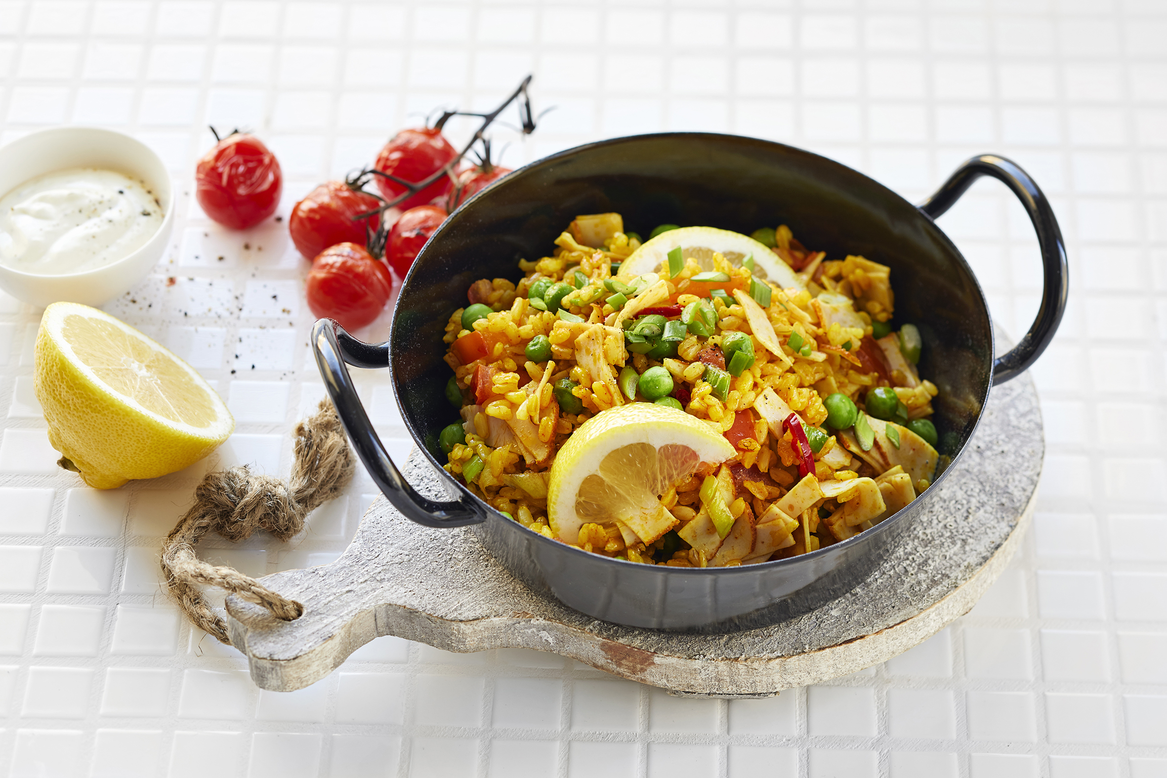 Arkinen paella syntyy nopeasti edellispäivän kypsästä riisistä paistetun riisin tapaan.
