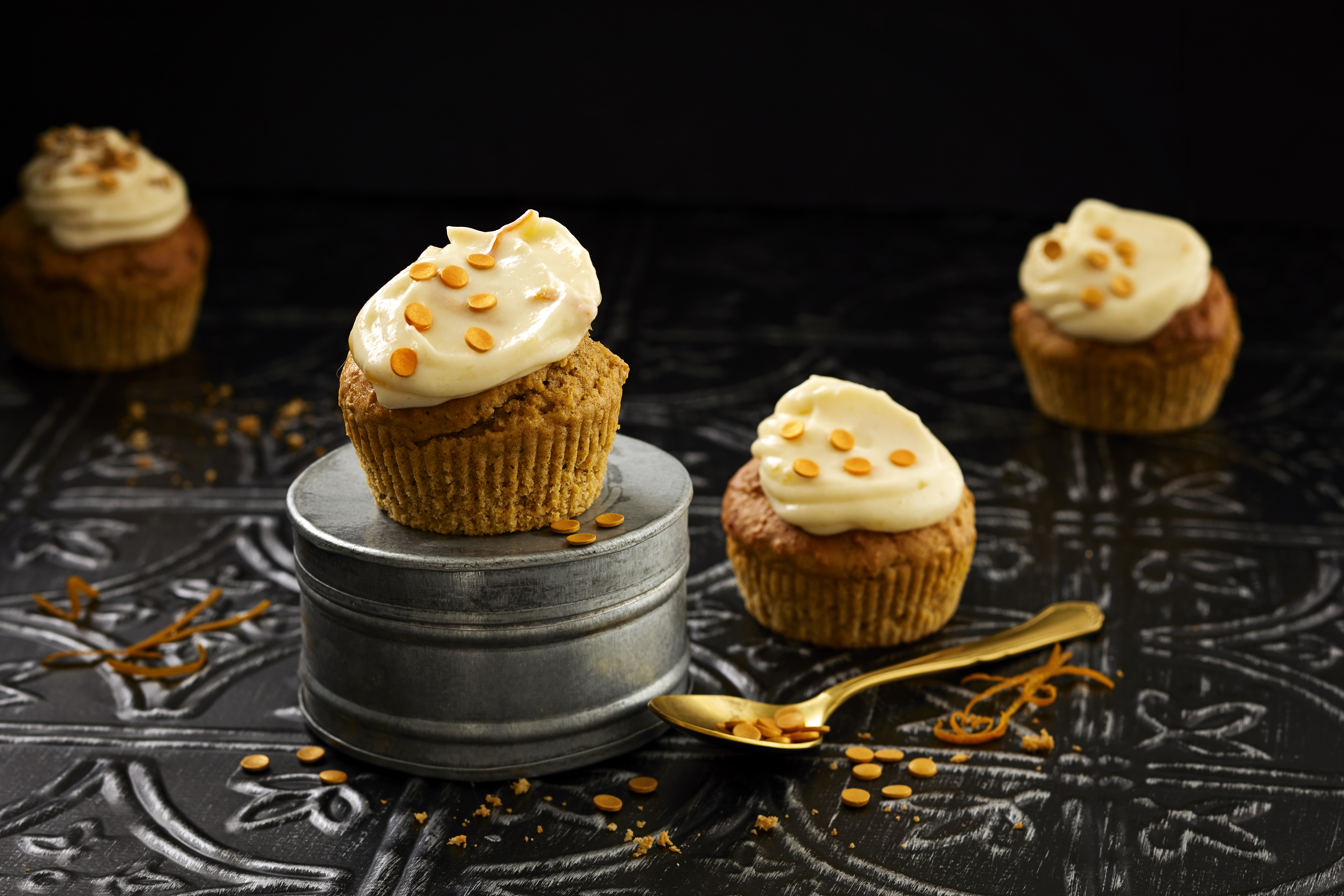Kivat kuppikakut saavat mehukkuutta bataatista. Appelsiinin makuinen kuorrute kruunaa kakkuset.