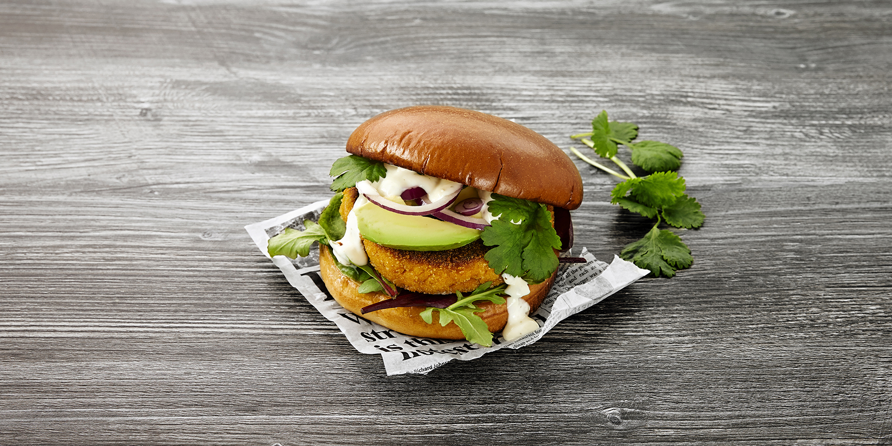 Paista myös sämpylät kevyesti pannulla. Täytä avokadoviipaleilla, salaatilla, sipulirenkailla sekä majoneesilla.