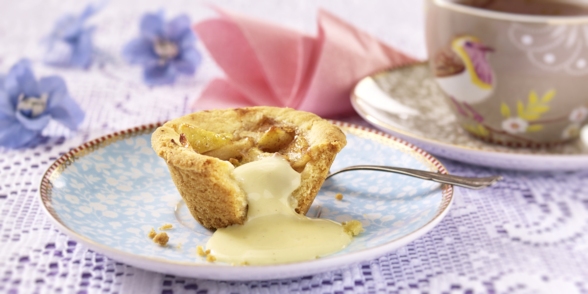 Vaahdota sokeri ja voi. Lisää muna hyvin vatkaten. Lisää kuivat aineet. Painele taikina peltisiin muffinssivuokiin. Annostele täyte päälle. Paista 175 asteen lämmössä noin 25 min. Tarjoa vaniljakastikkeen kera.