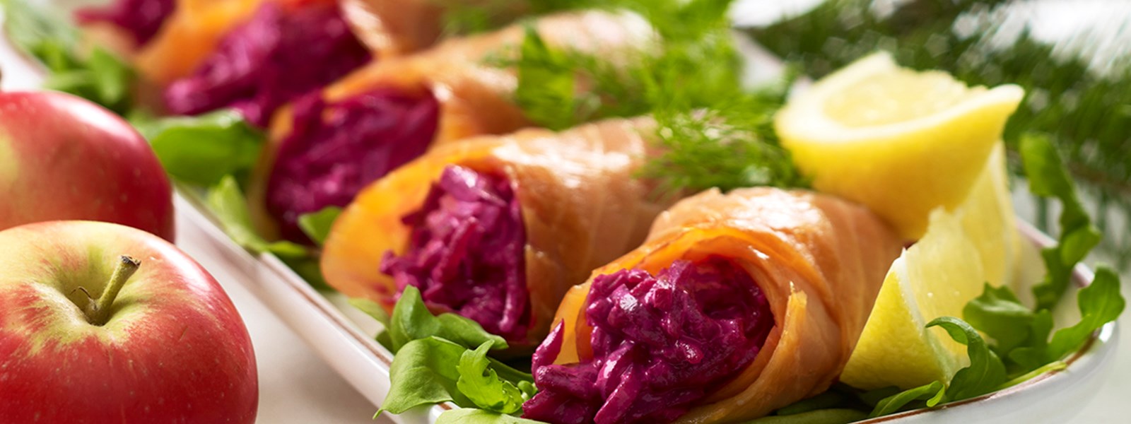 Levitä kylmäsavulohiviipaleet voipaperin päälle. Annostele lusikalliset punajuuri-piparjuurisalaattia viipaleiden päälle ja kääri rullalle. Tarjoa alkuruoaksi keitetyn perunan ja mallasleivän kera.