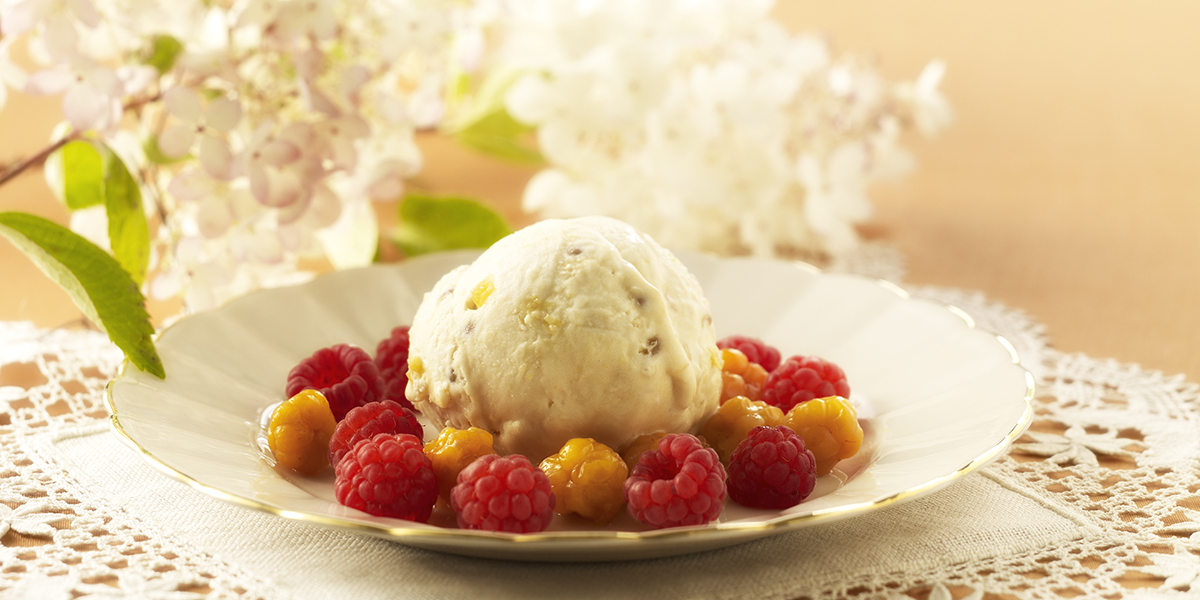 Vatkaa kananmunat vaahdoksi ja yhdistä vaahdotettuun kermaan. Lisää lakkahillo ja vaniljasokeri ja sekoita vaahto tasaiseksi. Annostele vaahto pieniin annosvuokiin tai isompaan vuokaan niin, että kinuskikastiketta tulee pariin väliin pursotettuna suoraan tetrasta. Peitä vuoat ja pakasta seuraavaan päivään. Kumoa jäädykkeet tarjolle, tai ota jäätelökauhalla palloja ja koristele herkku marjoilla.