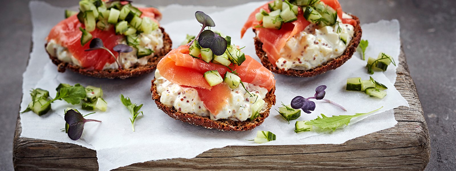 Asettele leipäpuolikkaat tarjoilualustalle. Sekoita perunasalaatti, kokojyväsinappi ja mausta ripauksella mustapippuria. Lusikoi maustettua perunasalaattia leipien päälle pieneksi keoksi. Asettele lohiviipaleet salaattikeon päälle.
