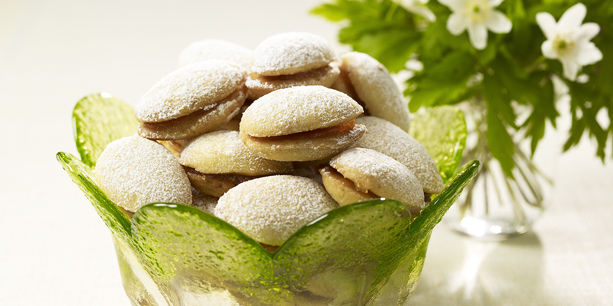 Kuumenna kattilanpohjalla voita niin kauan, että se on väriltään kullankeltaista. Vatkaa jäähtynyt voi ja sokeri vaahdoksi ja lisää kuivat aineet. Sekoita taikina tasaiseksi ja anna kovettua jääkaapissa n. tunnin ajan. Painele kahvilusikanpohjaa apuna käyttäen leivonnaisia uunipellille. Paista 200° C n. 6 minuuttia, kunnes leivonnaiset alkavat hieman saada väriä. Täytä jäähtyneet lusikkaleivät marmeladilla. Pyörittele sokerissa tai ripottele pinnalle tomusokeria.