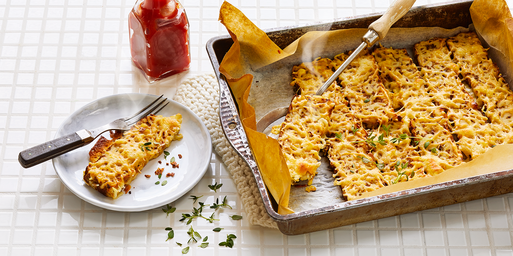 Kumoa kylmä vuoka leikkuulaudalle ja leikkaa laatikko viipaleiksi (n. 6 viipaletta/laatikko). Asettele viipaleet vieri viereen pellille leivinpaperin päälle. Ripottele pinnalle juustoraaste. Paista uunissa 200 asteessa noin 15 minuuttia, kunnes juusto on sulanut ja pinta on rapea.