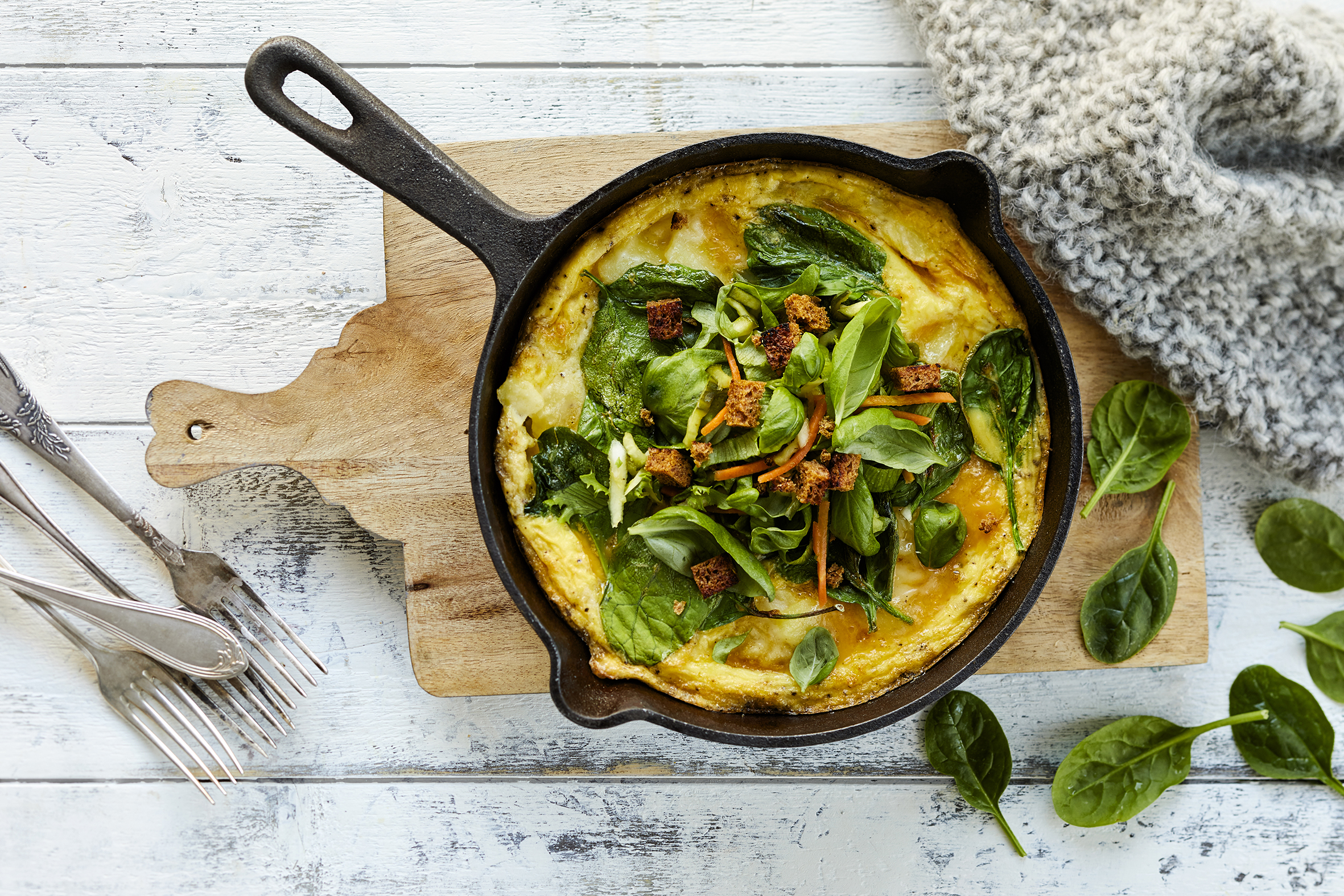 Nopea ja maukas peruna-pinaattimunakkaan pohja syntyy valmiista kermaperunoista. Munakkaan kanssa maistuu raaste ja ruiskrutongit.