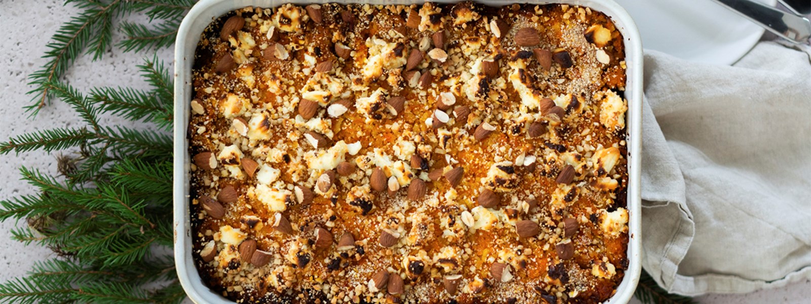 Voitele uunivuoka. Lusikoi porkkanalaatikot foliovuoista uunivuokaan ja tasoita pinta. Viimeistele pinta fetamurulla, mantelirouheella, murskatuilla kokonaisen mantelin paloilla, korppujauholla ja voinokareilla ennen uuniin laittoa. Anna paistua uunissa ilman kantta 175 asteessa n. 45 minuuttia tai niin kauan kuin pinta on saanut kauniin sävyn. Lisää päälle vielä raitoja hunajaa ennen tarjoilua.