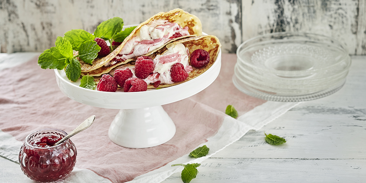 Paista pitsireunaisia räiskäleitä. Vaahdota kerma, lisää kevyesti sekoittaen vaahtoon Vispis ja hillo. Tuotteet saavat jäädä raidoiksi vaahdon joukkoon. Lämmitä räiskäleet ja täytä vaahdolla. Viimeistele tuoreilla marjoilla ja mintulla.