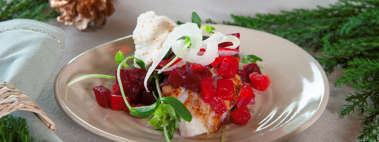 Koristele mätimoussella, kanelitangoilla, retiisiviipaleilla ja fenkolilla, joka on pyöräytetty sitrusvinagretessä. Koristele versoilla.
