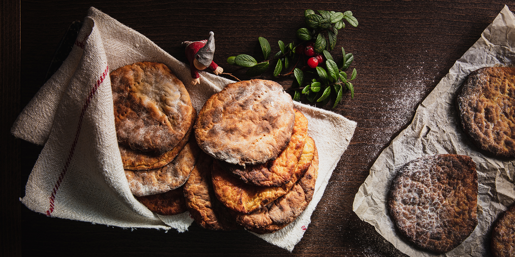 Tomuta kädet jauhossa ja painele rieskoista pyöreitä lättysiä. Tee rieskoihin muutama reikä haarukalla ja voitele ne voisulalla.