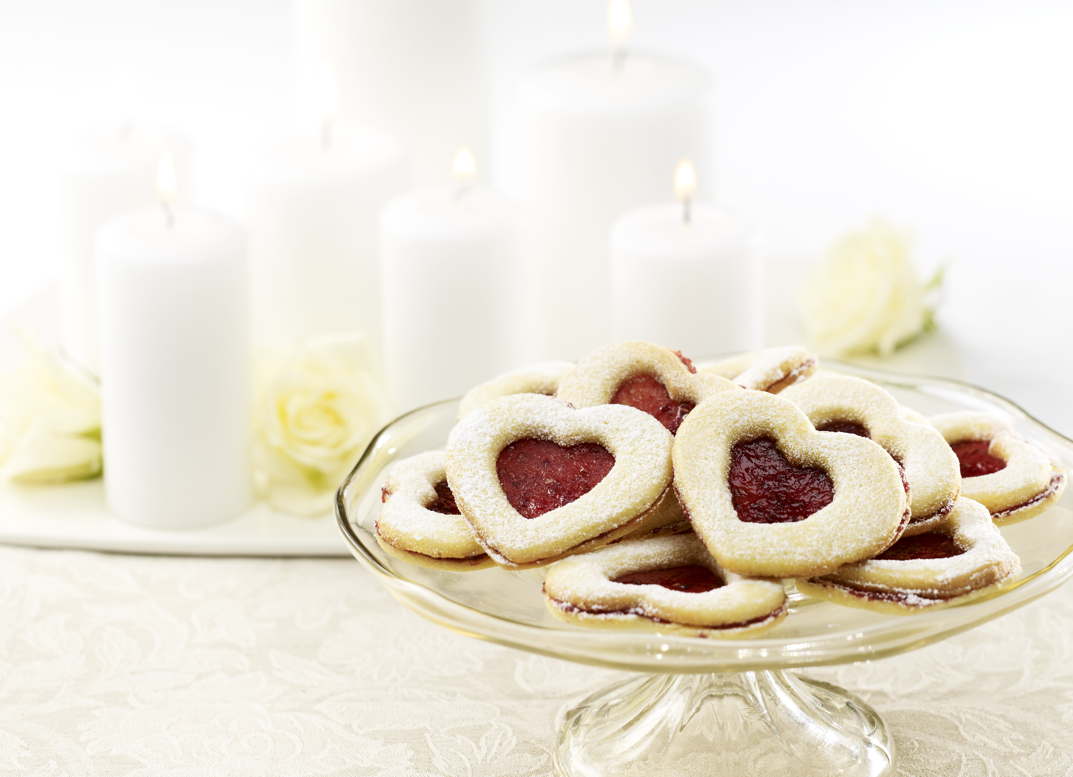 Kauli taikina 3:ssa erässä, jotta taikina ei pehmene liikaa huoneenlämmössä. Kauli taikina n. 3 mm:n paksuiseksi levyksi ja painele sydänmuotilla paloja taikinasta. Paina puoleen koko määrästä pienemmällä sydänmuotilla kolo. Tee tämä vasta pellin päällä, sillä taikina pehmenee nopeasti.