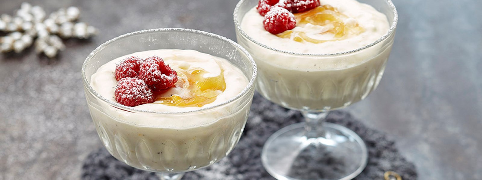 Vatkaa kerma vaahdoksi. Sekoita kerman joukkoon sokerit ja appelsiinin kuoriraaste. Kääntele kulhossa kermavaahto riisipuuron joukkoon ja jaa vanilja-appelsiiniriisi annosmaljoihin. Laita jokaisen annoksen pinnalle teelusikallinen appelsiinimarmeladia ja pyöräytä se riisipuuron kanssa sekaisin lusikan varrella. Viimeistele jälkiruoat muutamalla vadelmalla ja tomusokerilla.