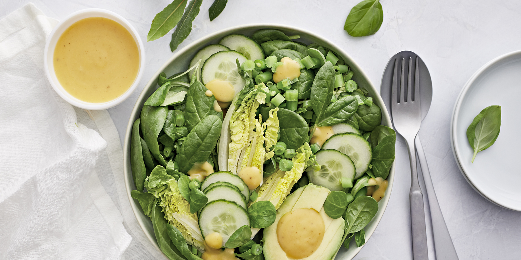 Paloittele sydänsalaatti isoiksi paloiksi. Viipaloi kurkku, avocado ja keitetyt pitkäpavut. Lisää salaattipinaatti ja viimeistele Kartanon salaattikastikkeella.