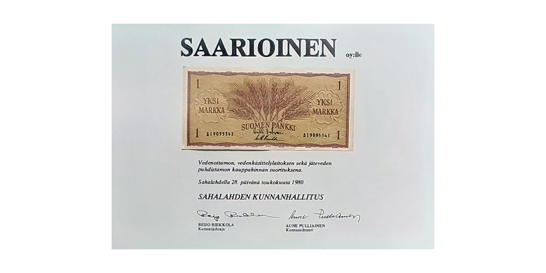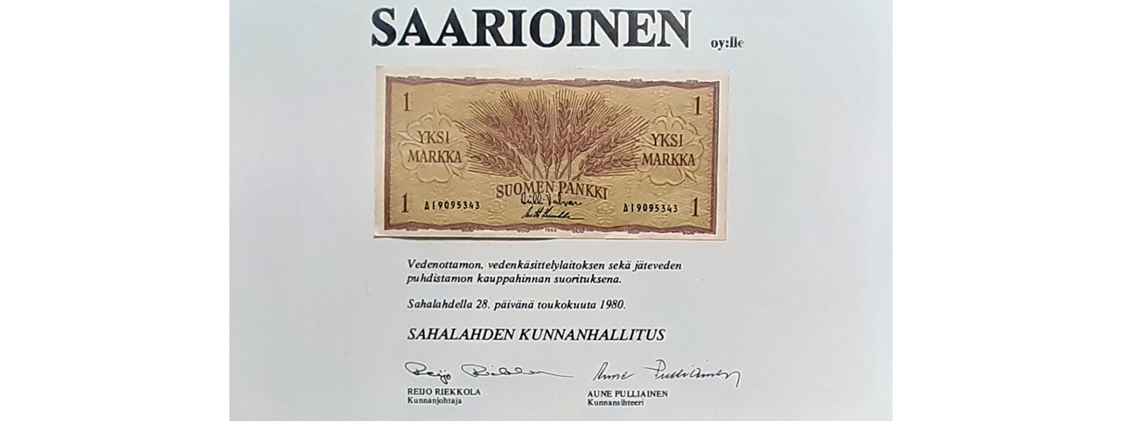 Vesihuoltolakia uudistettiin sittemmin niin, että kunnille tuli velvollisuus huolehtia jätevesien puhdistamisesta. Sahalahden kunnalla ei tuohon aikaan ollut merkittävästi investointivaroja, jolloin sovittiin Saarioisten puhdistamon myynnistä kunnalle nimelliseen yhden markan hintaan. Puhdistamon toiminta jatkui ennallaan, mutta kunta täytti nyt lakisääteisen velvoitteensa.”