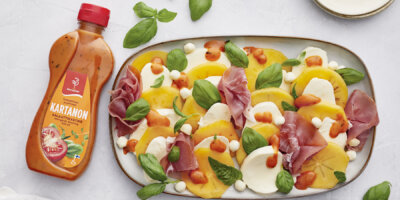 Rapsiöljy, vesi, tomaattisose, siirappi, sokeri, appelsiinitäysmehutiiviste, punaviinietikka, etikka, mausteet (SINAPINSIEMEN, valkosipuli, mausteyrtit, paprika, sipuli, mustapippuri, valkopippuri), muunnettu maissitärkkelys, jodioitu suola, sakeuttamisaine (E 415), säilöntäaine (E 202).