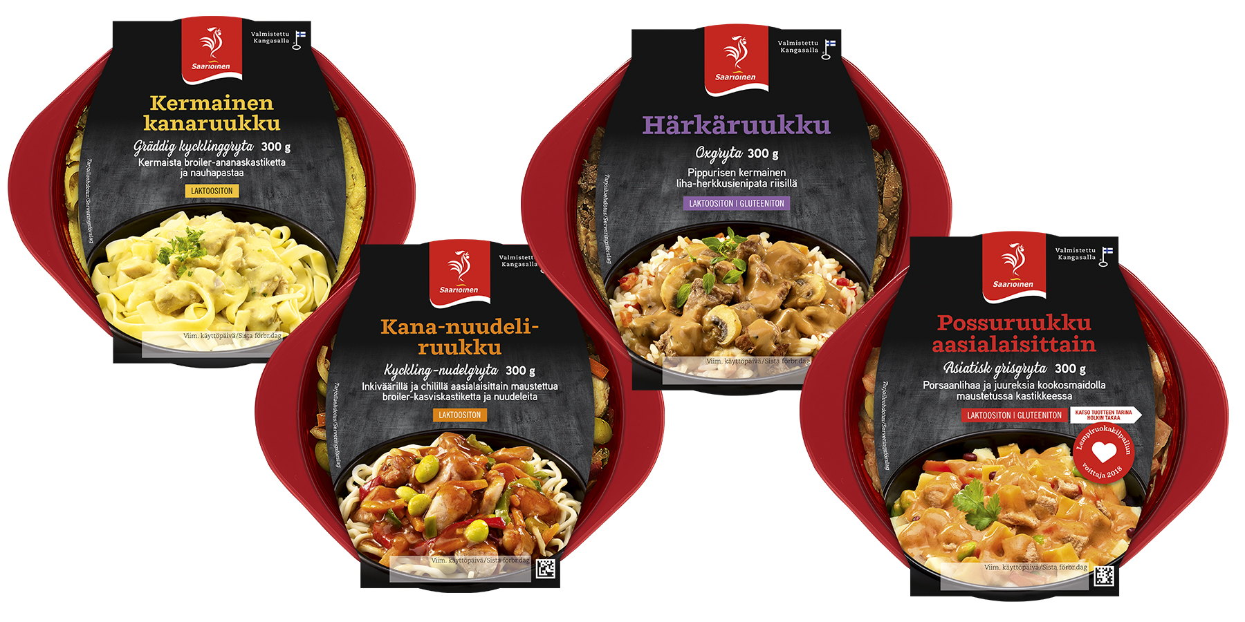 Saarioisten valmisruoka-annosten pakkausten musta muovi korvataan punaisella muovilla tämän syksyn aikana. Punainen pakkausväri valikoitui kuluttajatestaustausten perusteella.