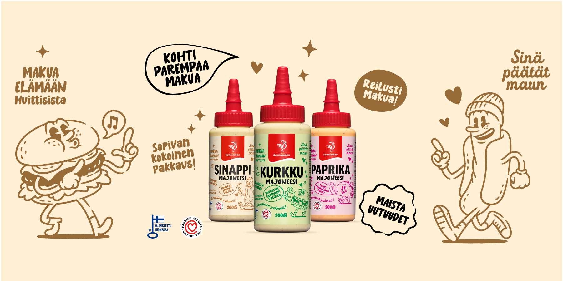 Saarioinen lanseeraa kastike- ja majoneesimarkkinoille kolme uutta majoneesia. Näistä uusi Sinappimajoneesi hurmaa suomalaiset, joita voi jopa nimittää sinappikansaksi. Täyteläinen ja sopivan sinappinen uutuus kruunaa hodarit, makkaraperunat, burgerit ja muut grilliherkut. Myös street food -syöminen viedään uutuuksilla nyt kohti parempaa makua.
