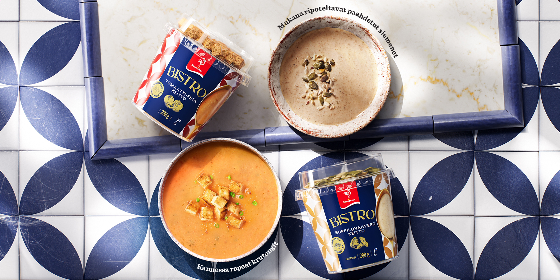 Bistro-keitot sopivat täydellisesti hemmotteluun ja makuelämysten tuottamiseen. Suppilovahverokeitto ja Tomaatti-fetakeitto vievät sinut herkullisiin makumaailmoihin, joita täydentävät rapeat siemenet ja krutongit.