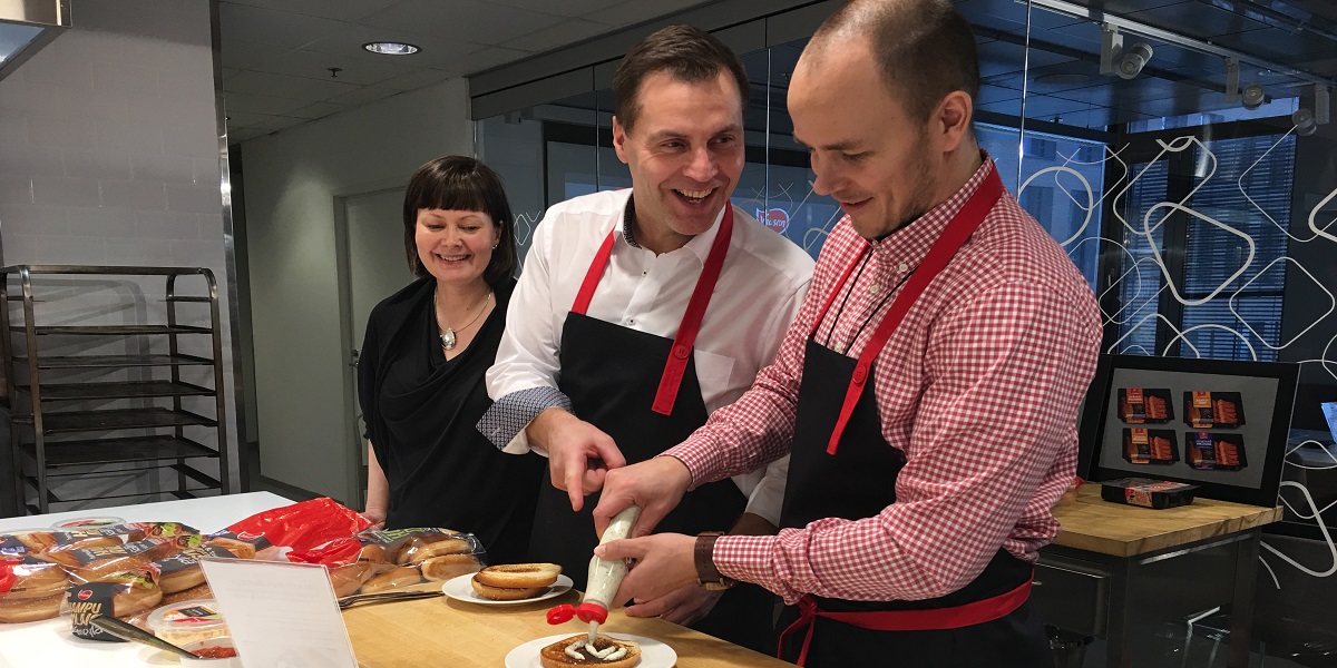 Kuvassa Saarioisten tuotepäällikkö Laura Hiltunen, vähittäiskaupan myyntijohtaja Hannu Hostio ja osto- ja myyntipäällikkö Janne Vuorinen, Kesko.