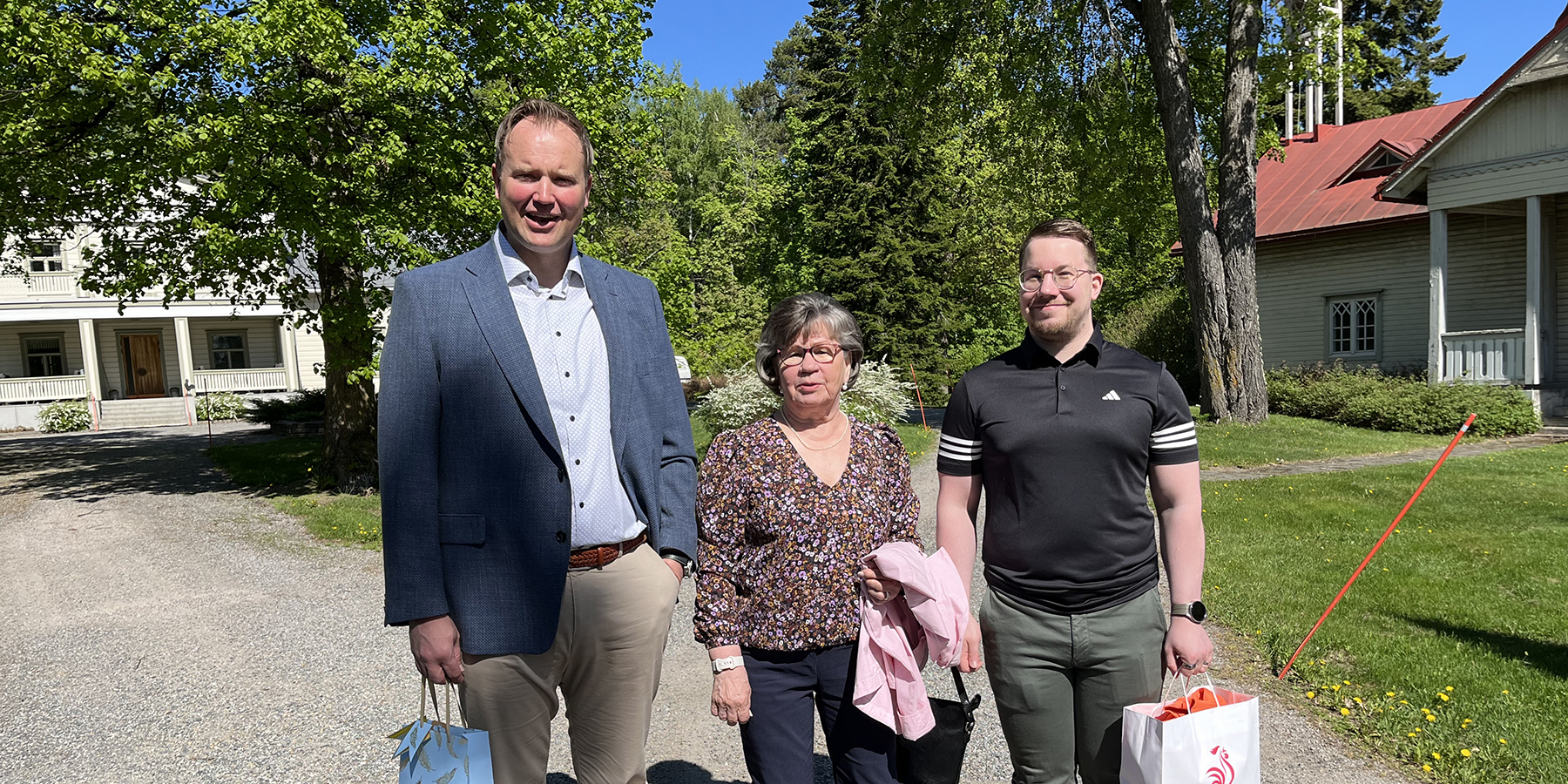 Toukokuun vehreimpään aikaan vierailu järjestyi. Sinikka-mummo ja Ville saapuivat Saarioisten pääkonttorille toimitusjohtajan vieraaksi. Sinikalla oli Ilkalle jopa pieni tuliainen mukanaan – villasukat tietenkin! Matka jatkui Tampereelta Saarioisten kartanolle Sahalahteen. Kartanon emäntä Eija hemmotteli vieraita monenlaisilla herkuilla. Tämän jälkeen ohjelmassa oli tutustumista Saarioisten historianäyttelyyn Ilkan johdolla. Näyttely on koottu kartanon pihapiirissä sijaitsevaan rakennukseen ja kertoo kattavasti Saarioisten hienon ja monitahoisen historian vaiheista. Upea kartanomiljöö uinuvan puutarhan keskellä ja Saarioisten historian käänteet taisivat olla vieraillekin hienoinen yllätys. Oltiinhan kuitenkin Suomen suurimman valmisruokatehtaan kyljessä.
